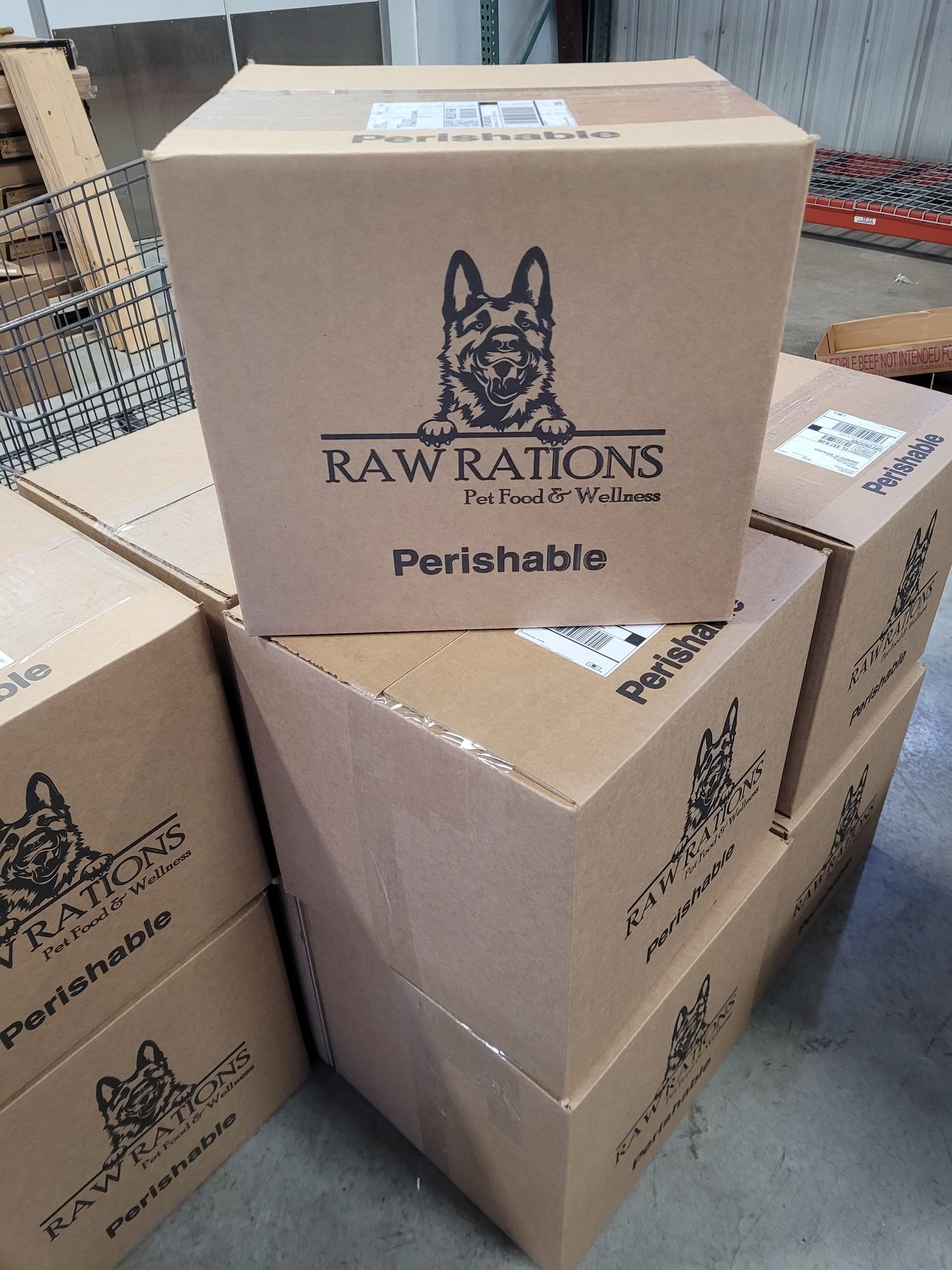 We offer shipping via UPS for our frozen pet food. The box can hold a maximum of 45 lbs. If you would like dry ice in your box, the maximum amount to order is 40 lbs.